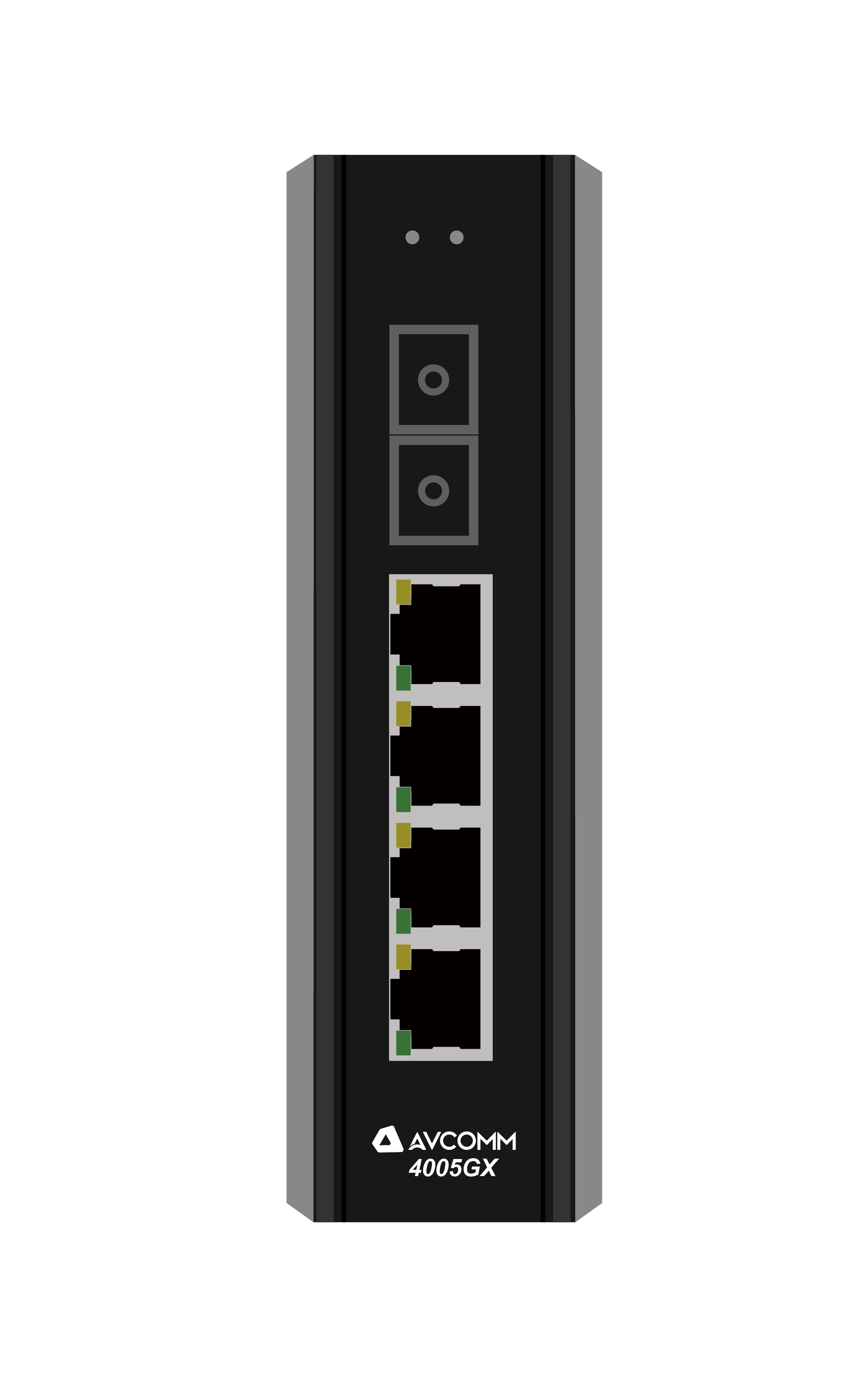 AVCOMM 4005GX is 4-port 10/100/1000Base-TX RJ-45 and 1-port 1000Base-X unmanaged Ethernet switch with reverse polarity protection of AC or DC input. It is highly scalable and can transmit data over long distances through fiber-optic ports. It has wide operation temperature range, high anti-EMI capability to ensure stable work in harsh industrial environments and supports DIN Rail-mounted/wall-mounted to facilitate in various industrial network applications.
