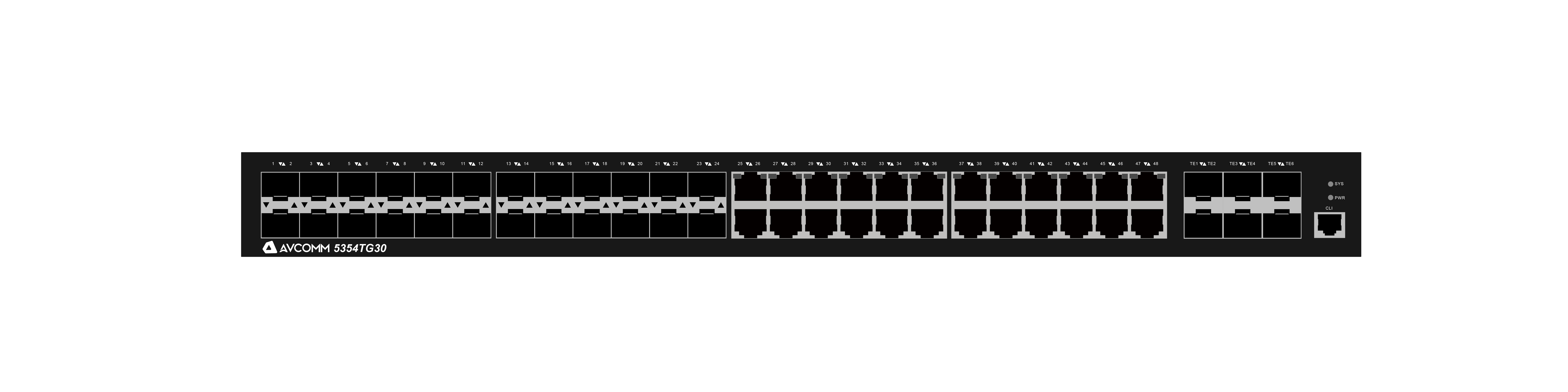54-port industrial data switch, 3 layer, 24 RJ45 Ports 10/100/1000Base-T(X), 24 SFP Slots 1000BaseSFP+,6 SFP Slots 1G/10GBaseSFP+, fan-less, Rack Mounting, standard built-in power supply 100-240VAC, 0°C-50°C